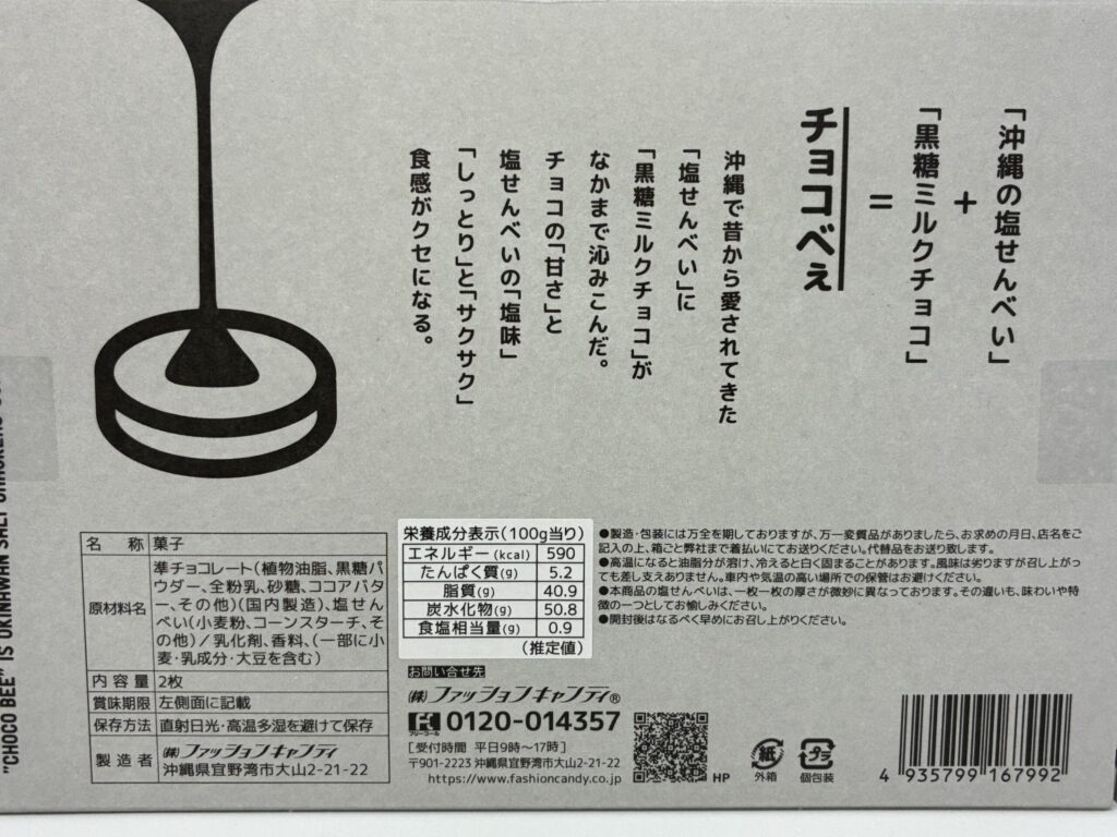 塩せんべい×黒糖チョコという沖縄独自の甘じょっぱさ。話のタネにもなり、「これ沖縄で買ってきたんだよ」の一言で会話が弾みます。