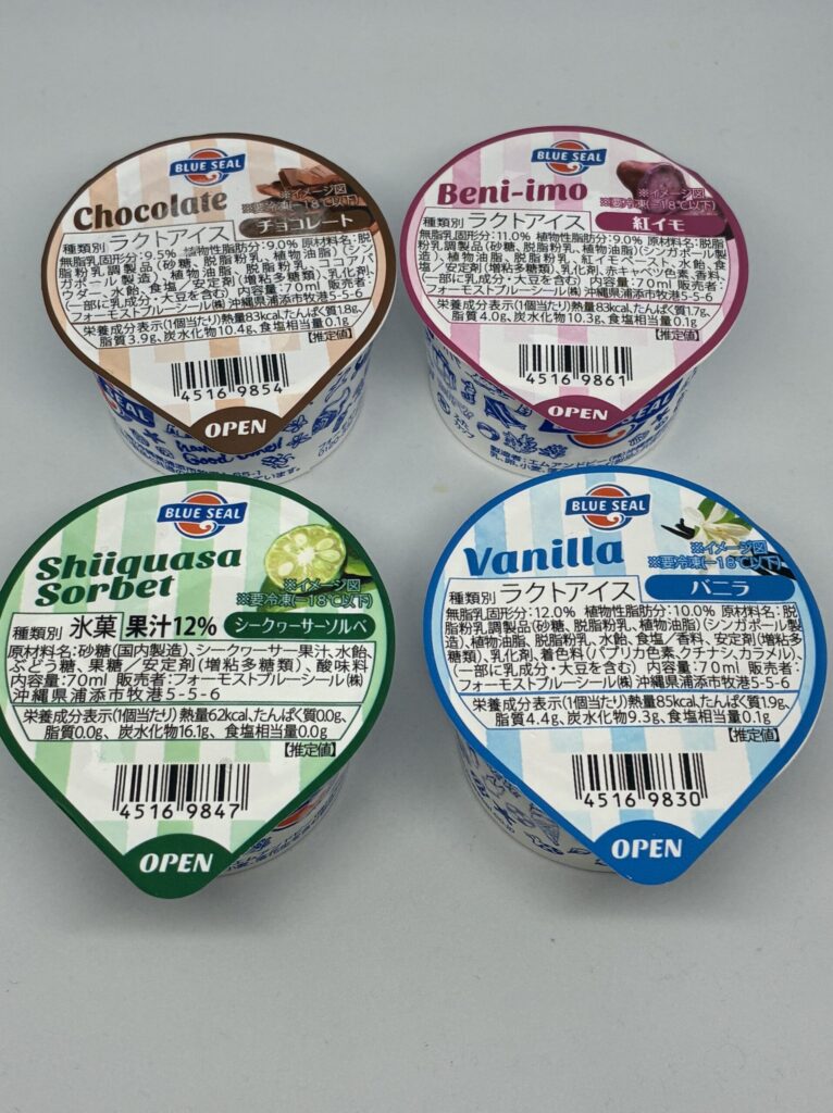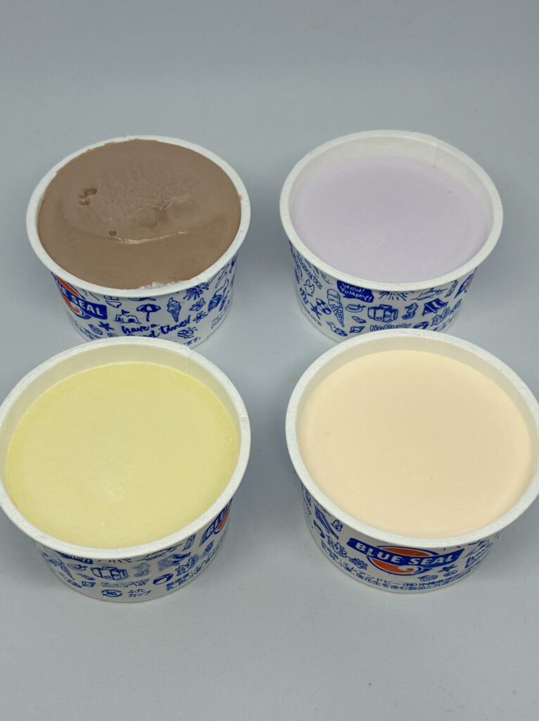 沖縄の定番アイスといえば「ブルーシール」イオンでは小カップ(内容量70g)のバラ売りがあり、5〜6種類で安価(1個100円以下)で買いやすいのもポイント。