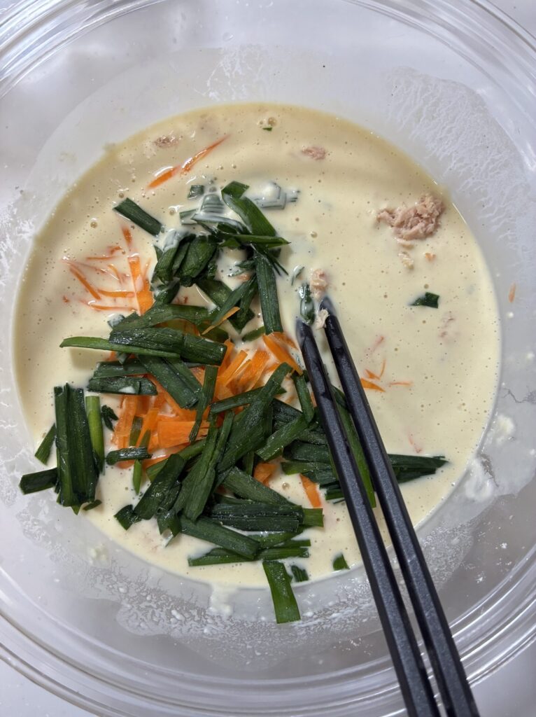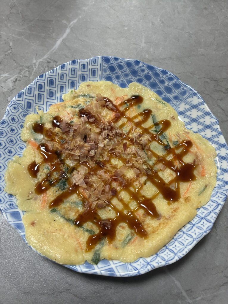 沖縄版のお好み焼き。小麦粉、卵、水を混ぜた生地にニラやツナ缶などを加えて焼いたシンプルなおやつです。
