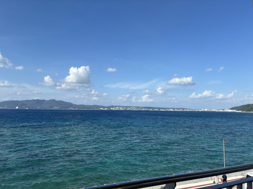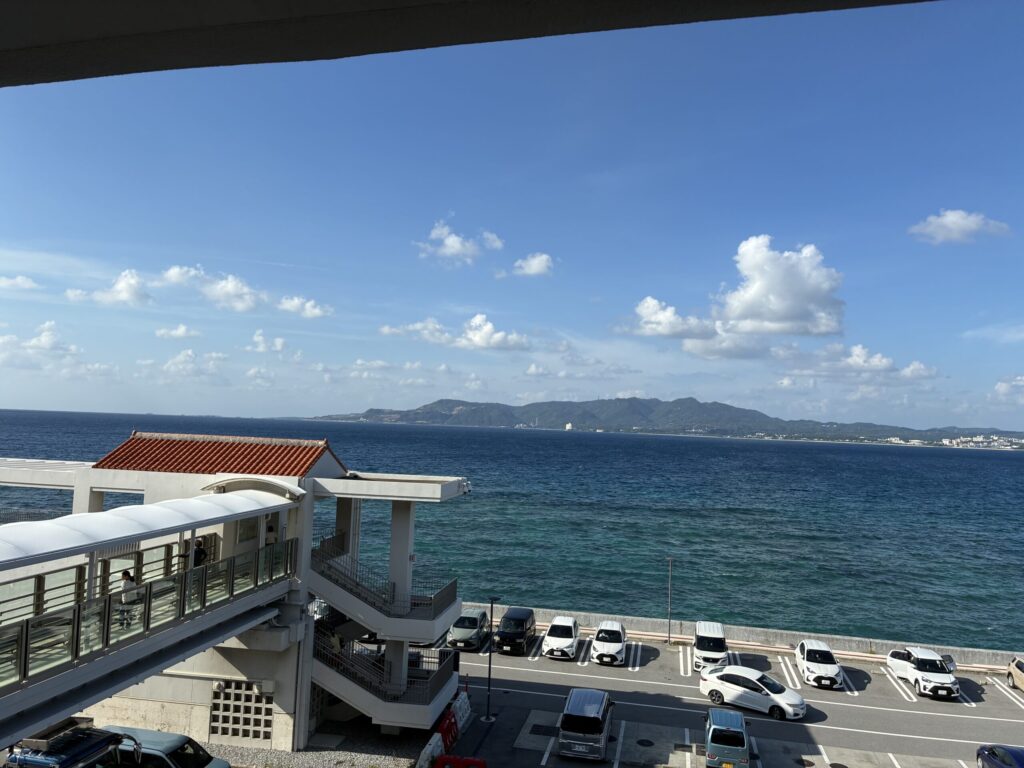道の駅許田の海側にあるターミナルは、東シナ海を一望できる絶景スポットとしておすすめです。天気の良い日は海風が心地よく、本部半島を一望できる海の景色に子どもといっしょにテンションも上がるはずです。