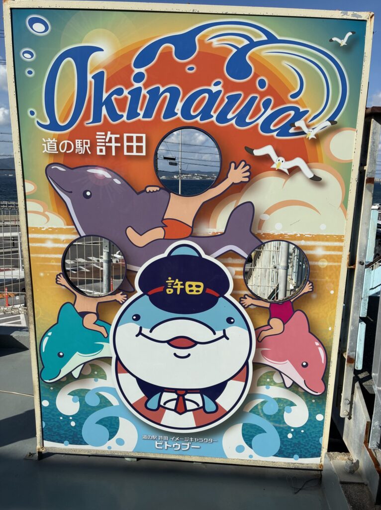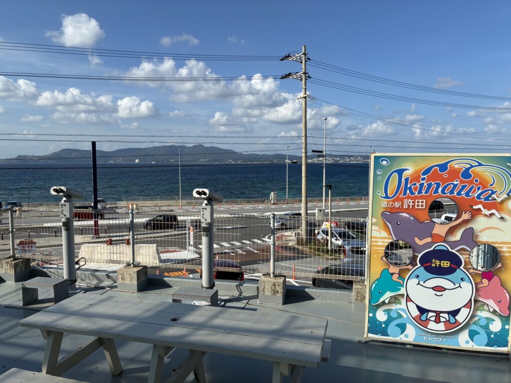道の駅許田の2階テラスのエリアにはフォトスポットと観光望遠鏡が設置され、本部半島と東シナ海を満喫しながら道の駅許田のイルカのキャラクターと記念撮影。